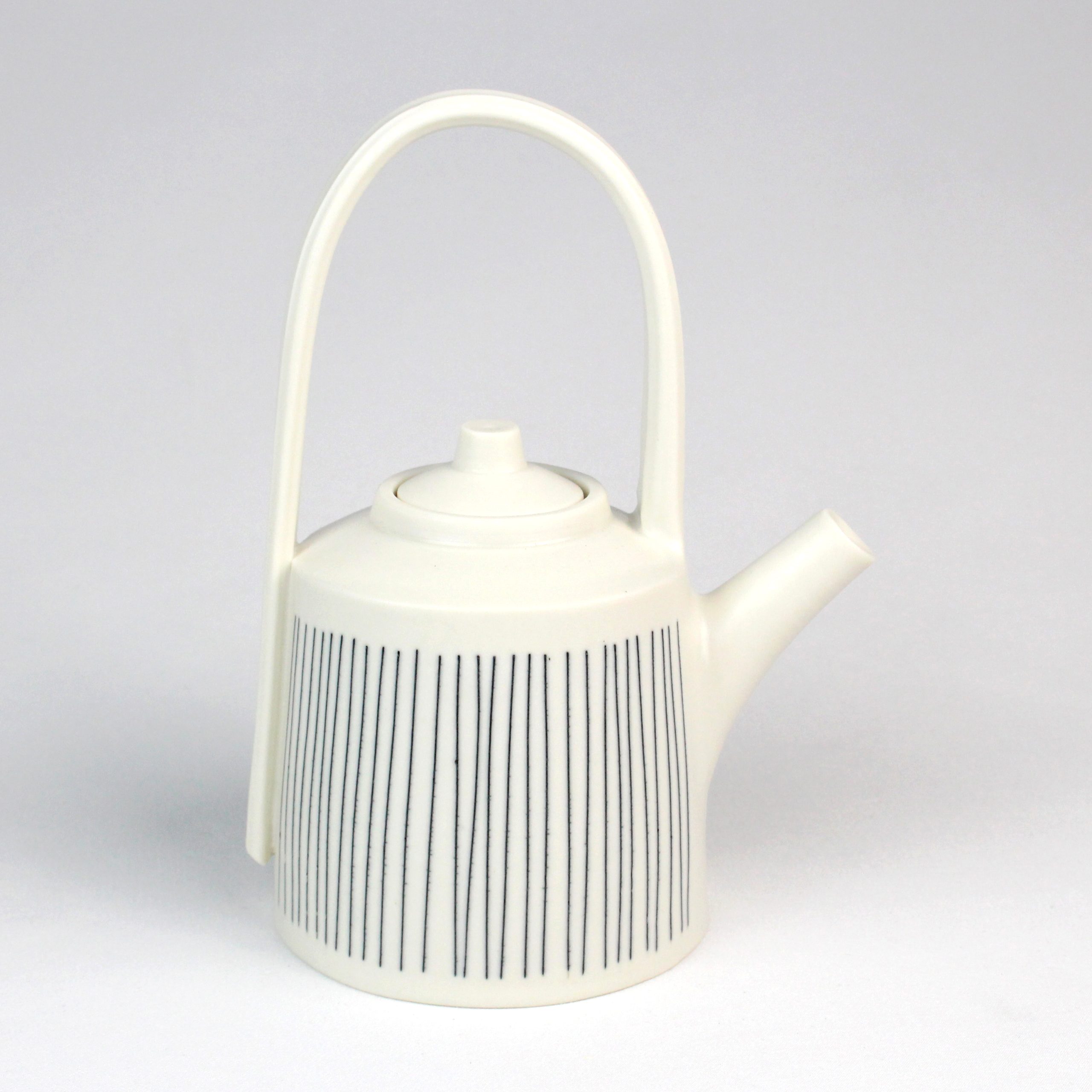 Working alongside raising a family, Vicky’s practice has continued to develop, shaped by an ever-growing understanding of material and process. Her work is wheel thrown in porcelain, then carefully finished with delicately incised and inlaid lines of slip, or with sgraffito stripes. These crisp, hand drawn marks introduce gentle variations, giving each piece its own distinctive character. The work is fired in an electric kiln.